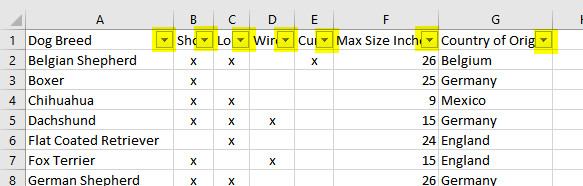 When you have a large list of items on your spreadsheet, sometimes you only want to look at certain items, say dogs with curly hair. Let’s make a spreadsheet of dog breeds and traits; you may copy and paste the list below into Excel. (I own a type of Belgian shepherd called a Belgian Tervuren whose story you can see on her website at sahzidog.blogspot.com.)