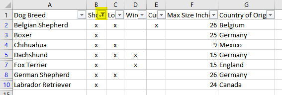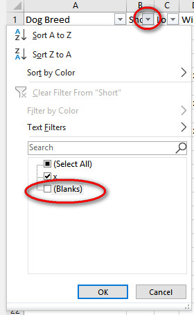 To look at just the short hair dogs, click on the triangle in the “Short” column. When the drop-down filter menu appears, click on the check next to “(Blanks)”. This will deselect or hid any cells below that are blank. In this case, only the cells with an “x” will remain visible. If the cells had x’s and o’s, you could click on “(Select All)” to clear everything, then just click on the one you want and click OK. Now the down triangle will have a funnel next to it to show you that your are filtering that particular column.