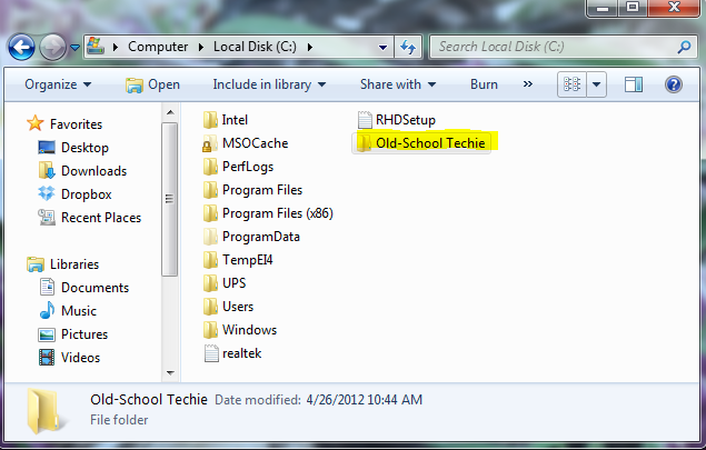 Let’s start with a folder. Use Windows Explorer to go to your favorite folder. For me, that’s my Old-School Techie folder on my c:\drive.