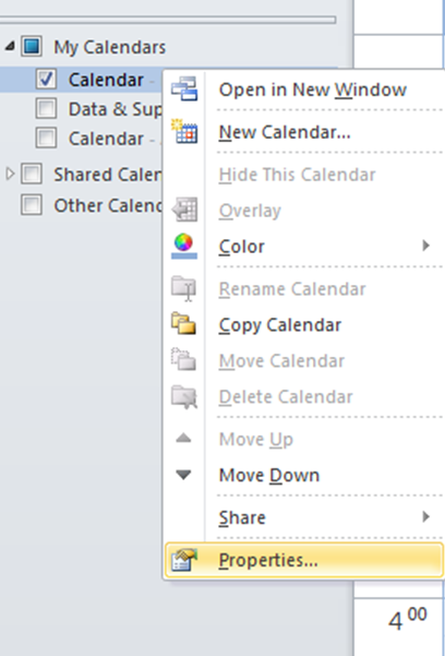 Open Outlook. Click on Calendar in the left hand navigation pane. Right click on My Calendar and select Properties.