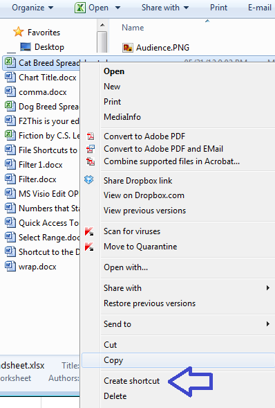 Select Create shortcut. This will create a shortcut in the same folder. Drag the new shortcut folder – NOT the original, the one that says “shortcut” into your Documents folder in Libraries. You don’t have to change to a new window; you may drag from right where you are.