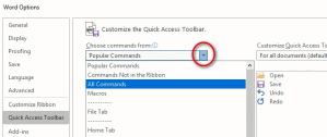 I never hung out with the “popular” crowd, so I don’t really want only the “Popular Commands.” Click the drop-down arrow next to “Popular Commands.” A new menu appears with choices such as “All Commands” and then by tab, such as “File Tab” or “Home Tab.” Choose “All Commands” so we can see everything!