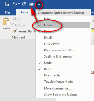 Those are great choices… for a beginner. Let’s click that Customize button and see what happens. When we click Customize, “more choices” pop up below. You can quickly click on these items to add choices to your Quick Access Toolbar. Click on “Open” to add the File tab>Open command to yours.