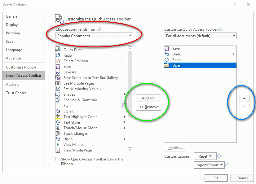 Let’s take a little tour of the Customize the Quick Access Toolbar window. Circled red, you will see that Word defaults to the “Popular Commands” choices. These are the items commonly added to the menu. You’ll see that “Redo,” “Save,” and “Undo” are already shown.