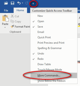 Let’s use “More Commands” instead of selecting them from this list. Click “Customize>More Commands…” from the drop-down menu. This brings up the Options window and goes right to “Quick Action Toolbar” menu.