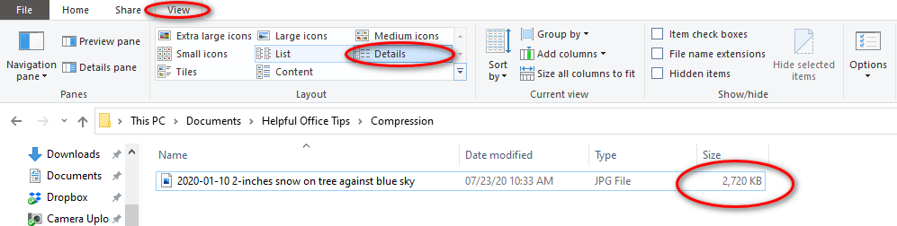 Let’s look at the details now. Choose in File Explorer>View tab>Layout>Details. Look at the difference in the size column between the original picture and the smaller image.