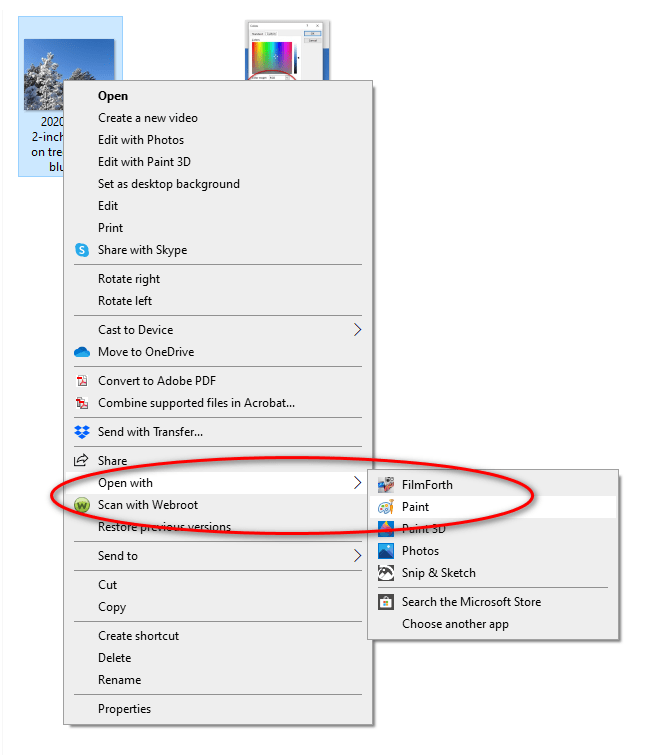 Find an image you want to resize in File Explorer. Right-click the image, and the right-click menu pops up. About two-thirds of the way down, you will “Open with…” Hover you mouse over “Open with…” Windows will give you several choices of programs you can use to open your image file. The default or automatic software is usually Windows>Photos which is best for cropping or changing the light settings of photos. Instead of the default, select “Paint.” Paint was an early image software to could draw or “paint” on the computer. (It’s great for kids.)