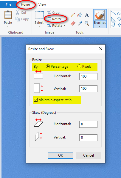 Don’t worry, we are going to “Resize” the image, which will take up much less storage space. In Paint’s menu click on Home tab>Image section>Resize. The Resize choices will appear. Notice that we can resize by percentage or pixels. Also notice that the “Maintain aspect ratio” will be checked. That means if you shrink the picture from top to bottom, you will also shrink the picture from left to right. The image will stay in proportion.