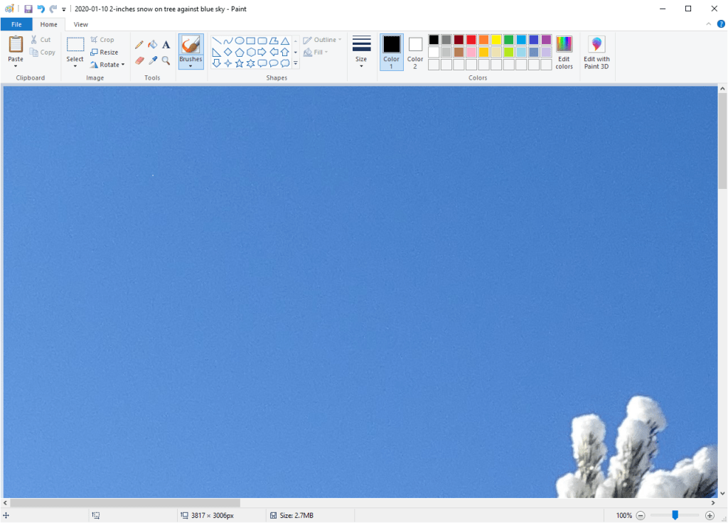 When you open the image in Paint, it will probably be huge! Your image will fall off the edge of the Paint Window. That is because Paint was created when images were 2 MP or 3 MP, not 20 MP (megapixel).