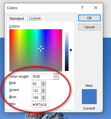 Let’s say I want to email this image or have it be my new profile picture. How do I make it more manageable for a website or email? I compress the image. This means that most of the blue sky will be one command for the computer to read, say “from this pixel to that pixel” make it a certain color blue. The computer doesn’t really know what a color is, but it knows to turn your monitor a certain value of ‘red green blue” (RGB) for each pixel. The main part of our blue sky has the “RGB Value.” Here is a screenshot of the color in PowerPoint to illustrate this. (You do not have to get this, but I thought it might help.) This blue is Red=63, Green=122, Blue=198. When the image is compressed, it tells it to use that color from the top left to the bottom right of that blue area. For certain “white snow” values, it does the same thing. Those commands use much less memory than going “blue, blue, blue, blue…” and so on for pixel after pixel.