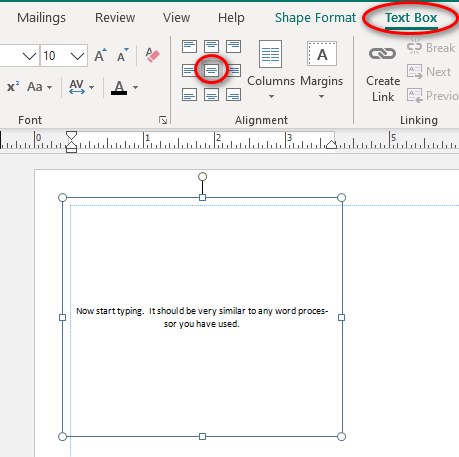 Click on your Text Box. Notice that a special “Text Box” tab has appeared on the ribbon. This is a “context sensitive” tab – I like to call it a “magic tab” that only appears when we need it. Some of its choices are typical for a word processor and some are very different.