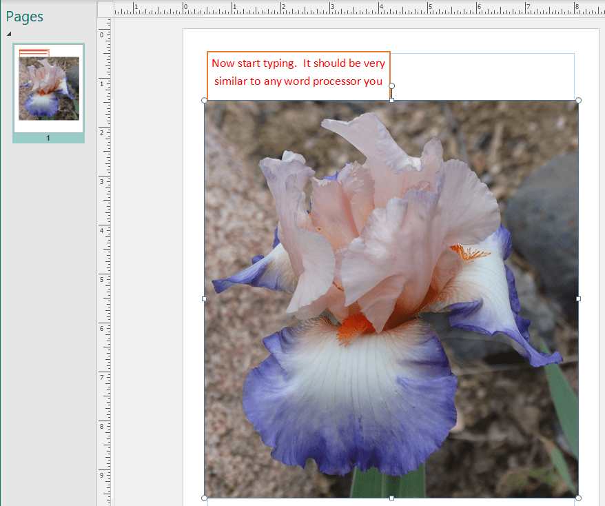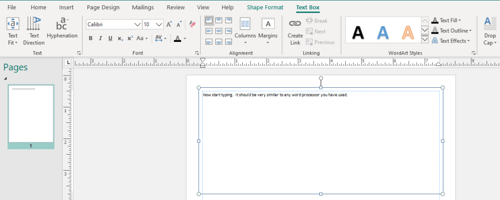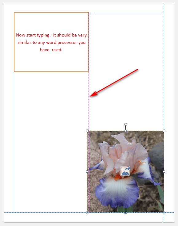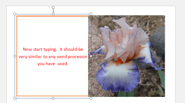 Now start typing. It should be very similar to any word processor you have used. Add about a line of text (or copy and paste the first two sentences of this paragraph). Click anywhere else on the page. The line around the textbox will disappear. Click back on your words, and the outline reappears. This outline is simply for your reference and will not print unless we change that, which we will do later.
