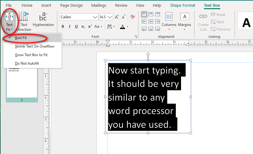 Every time you want to change something in any Microsoft 365 program, select it first. Drag through your text (or triple-click to select one line, or Ctrl A to select “All.” Now, experiment with those Text Box menus. First, click Text Box>Text section>Text Fit>Best Fit. Our text will fill up our available space within the box. Ctrl-Z to “Undo” and go back to the original.