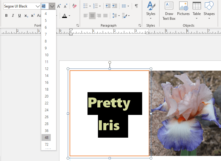 Let’s change the wording in your Text Box so it matches the photo. Drag through your text to select it. (You can also click on a word, then triple-click to select any paragraph. You can also click on a word, and press Ctrl-A to Select All within your Text Box.) Once your text is selected, anything you type will replace it.