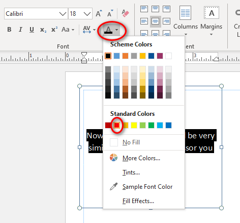 With the text still selected, click the drop-down arrow next to the letter A in the bottom right of the font section – the one with a bar of color below it. Select red to change our text red.