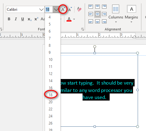 Change the text size, either use the drop-down arrow next to the font type (Calibri) and change the number to a larger number like 18, or click the “Increase Font Size” letter “A” right next to the number. The larger “A” makes the font bigger, one step at a time, and the smaller “A” makes the font smaller, one step at a time.