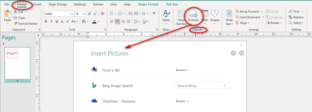 Let’s add an image to our page. From the Home tab>Objects section>click on Pictures. The Insert Pictures window will appear.