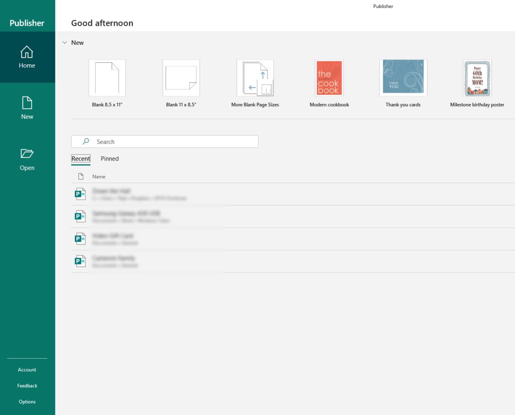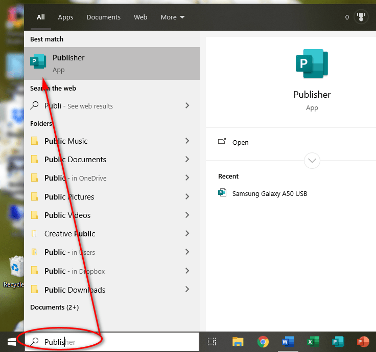 Publisher was not always included with MS Office, but the new Microsoft 365 plans include it, along with Word, Excel, and PowerPoint. To open Publisher, find the Windows Search bar or magnifying glass in your TaskBar, and type Publisher. Click on the Publisher icon when it appears.