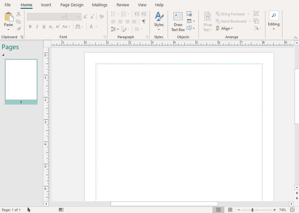 Let’s look at the Menus or “Ribbon” along the top. It should look very similar to MS Word’s ribbon: File, Home, Insert, then Page Design instead of Design and Layout. The choices on the Home tab are different and include “Draw Text Box.” That is because nothing automatically starts on the page. If you start typing, like you do in Word, nothing will happen. This is truly a blank page and we have to “Insert” a text box for typing or “Insert” a picture go add anything. The Home tab puts those shortcuts right on this page, as well as the Insert tab, just to give you a hint on how to being.