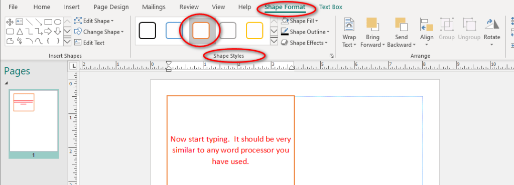In the Shape Format>Shape Styles section>select the red box with the white center. This adds a red outline and white “fill” to your box. You do not see the white fill on white paper, but it would cover something else, as we will see later.