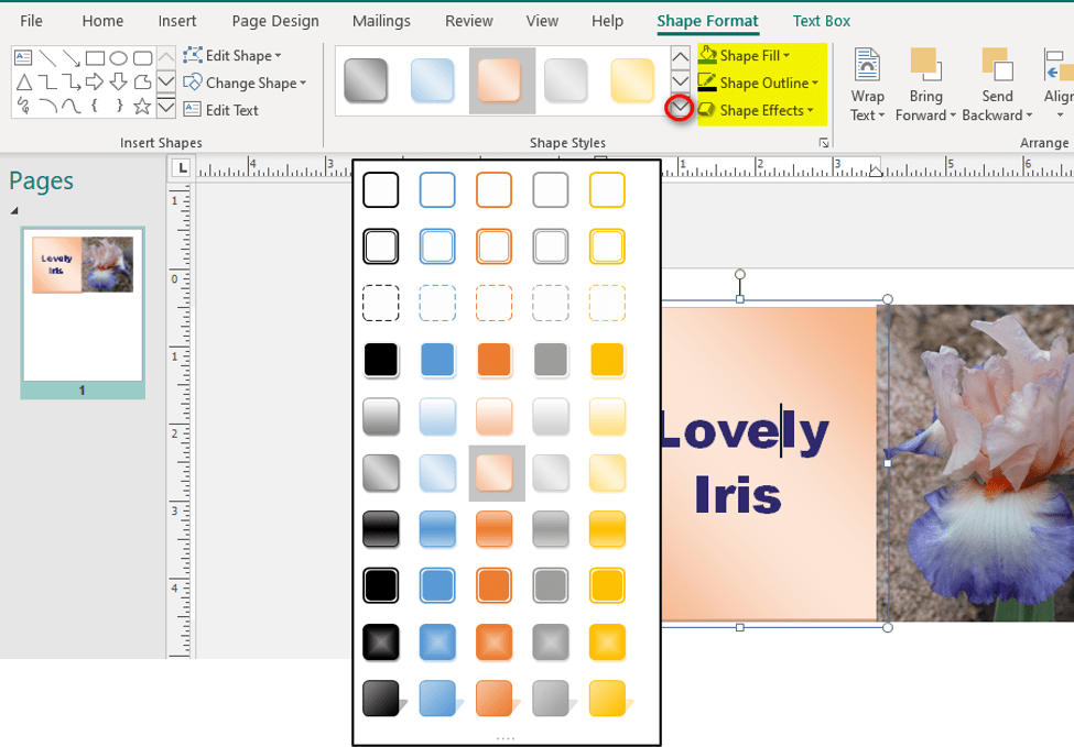 To change the Text Box style, click anywhere in the box to select it. Now go back to the “magic” Shape Format tab that appears. Select the drop-down arrow next to the Shape Format>Shape Styles section choices – circled red below. Pick a style that matches your photo. You can also adjust the Fill, Outline, and Effects manually in the Shape Format>Shape Styles section – highlighted in yellow below. Experiment! Remember, Ctrl-Z = “undo” if you goof.