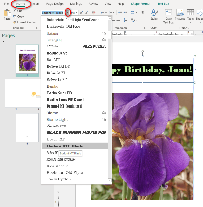 Change your font to something that looks nice and befits the occasion. Be sure your greeting is still selected within the Text Box. All the font are listed alphabetically in their font style from the Home tab>Font section>Font drop-down. Pick a bold font that is legible, aka easy-to-read.