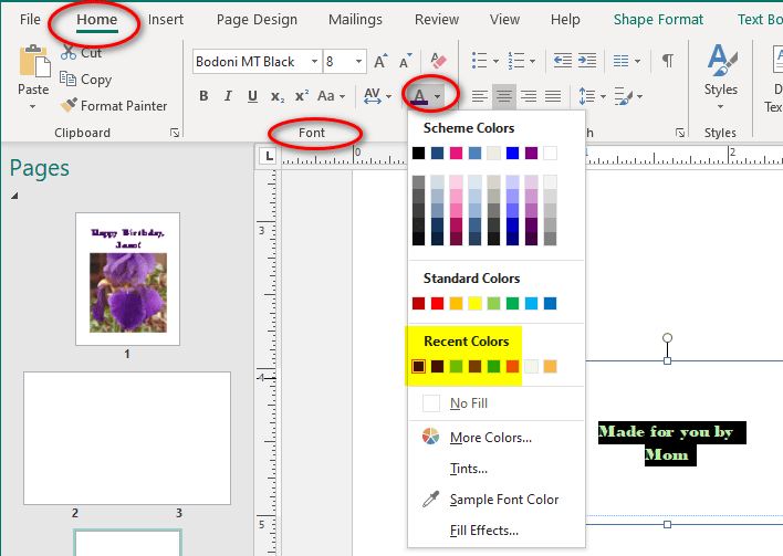 To get you in the swing of things, let’s add a byline on the back of the card first. Click on Page 4 in the Pages pane. Insert a Text Box that stretches from one blue margin line to the other, starting around 4” and going to the bottom right of the margins. Within your Text Box type, “Made for you by” and press Shift-Enter. (Shift-Enter adds a single space between lines instead of a new paragraph.) Add your name or “Mom,” “Dad,” “Sis.” The more personal, the better.