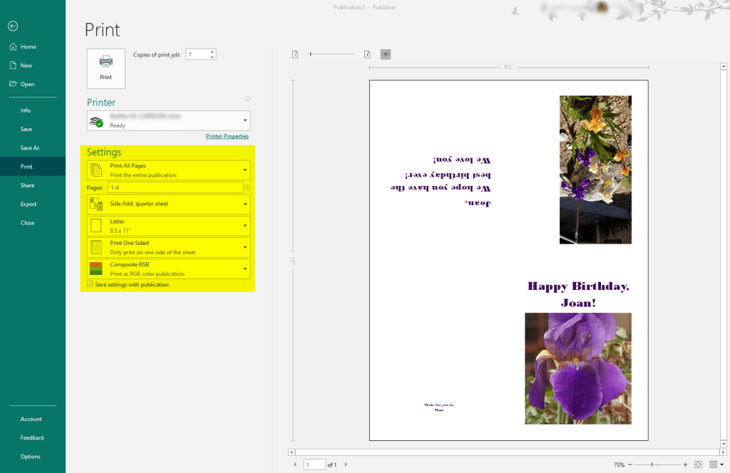 Go to File tab>Print for a print preview. The Print page will show the current settings for this template. Notice that Pages 1 and 4 are right-side up along the bottom and Pages 2 and 3 are upside down on top! If you are only seeing one page, your settings are not set to “Side-Fold, quarter sheet.” Look through your settings so that they are similar to the screenshot below, but with your printer showing. There is a checkbox at the bottom, reminding Publisher to save all these settings with your document.