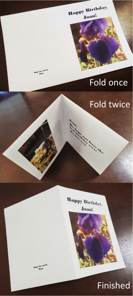 This is the perfect template for making quick inexpensive greeting cards, such as a birthday card for your grandchildren! (I always keep some 24 lb heavyweight bright white printing paper around just for these.)