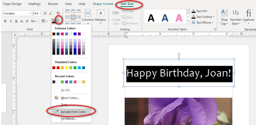 Match the color of your font to your image with the “Dropper” tool. Always select your text first BEFORE you make any changes. From the Home tab>Font section>Font Color drop-down, select the dropper icon. Your cursor will change into an eyedropper or “dropper” cursor. Click and drag the dropper over a nice dark color in your image. You will see a sample of the color in a box about the dropper. Once you find the color you like, release the mouse. Your font will match your image color exactly.