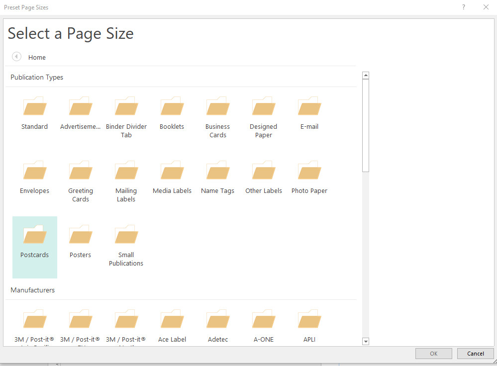 The Preset Page Sizes window will pop-up. Select the Postcards folder.