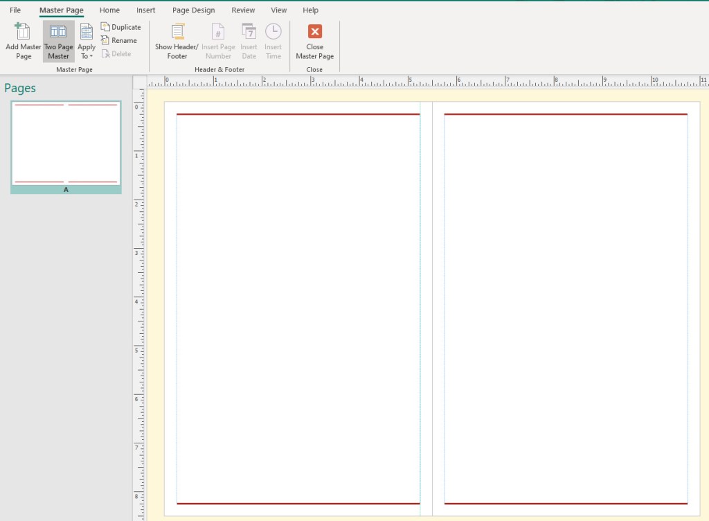 Anything and everything you put on this “Master” page will appear on each page of your document. Do you want a bright red square in the middle? Put it on the Master page.