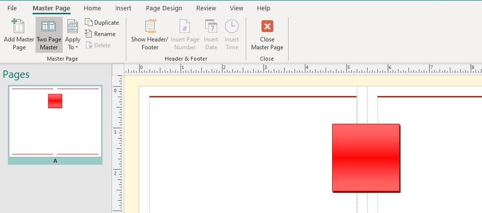 Close the Master by clicking the large Master Page “X.” Now look at your document. Each page has a big red square. Try to delete it? Nothing happens. You can only delete “Master Page” items from the Master page.