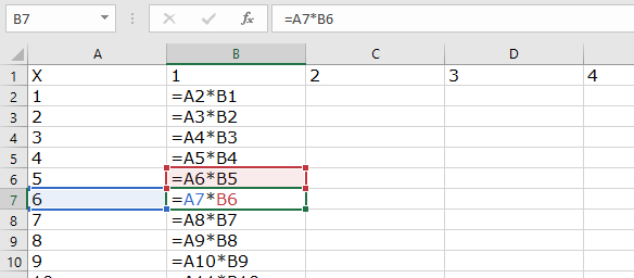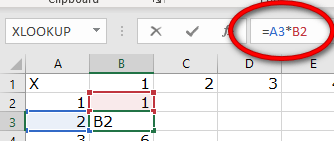 Look at the Formula Bar for Cell B2. You always want to use the numbers in Column A to multiply.
