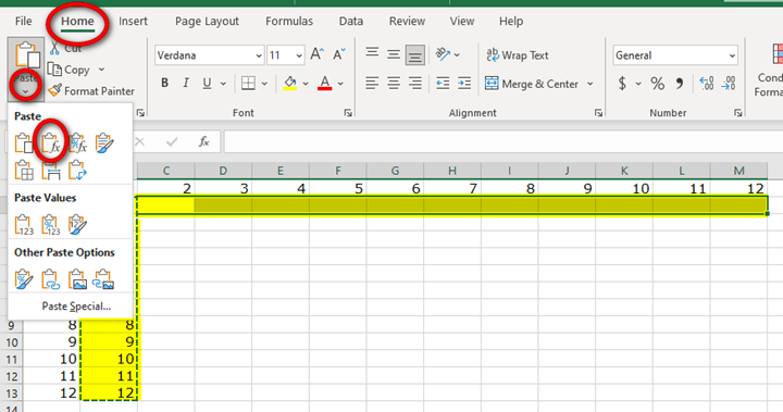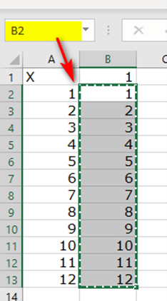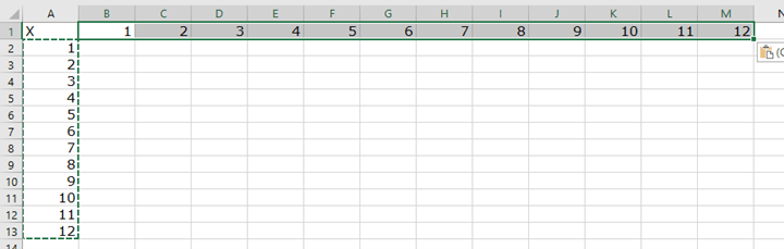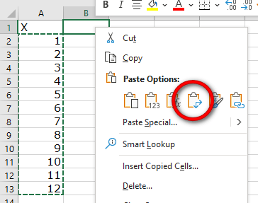 Drag through Cells A2:A12, so that our numbers 1 to 12 are selected. Right-click Copy to copy this to the Excel Clipboard. A green dotted marquee outline will appear. Click on Cell B1, just to the right of our “X.” Now right-click and look at the paste options. Hover your mouse over the one with paste clipboard with the two arrows: one pointing down and one pointing right.