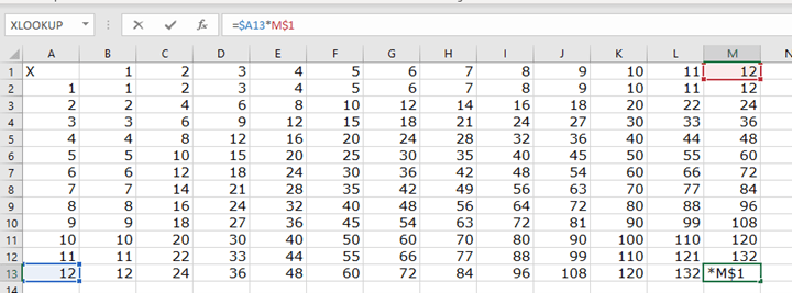 Click on Cell M12 which should contain the value of 144. Click on the Formula Bar. The formula has changed from our original =$A2*B$1 to =$A13*M$1. Notice that the “$A” and the “$1” DID NOT change because those references were “absolute.”