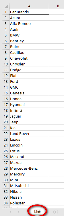Instead of typing, which is prone to errors and typos, simply click the drop-down arrow next to Cell B1. Our List of car brands will appear. Use the scroll bar to the right of the drop-down list to see all the cars. Select the brand of your very first car by clicking it. Excel will put the brand into Cell B1.