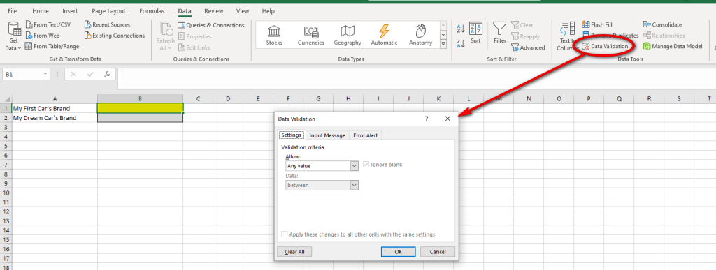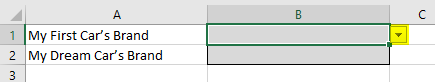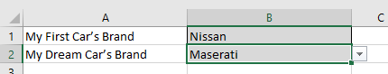 Practice Data Validation in Cell B2 by going back through each step. You can also copy Cell B1 to Cell B2. Select “My Dream Car’s Brand” from Cell B2’s drop-down menu. Which car is your dream car? I like those orange pearl Maserati’s. I’ll take any model, okay?