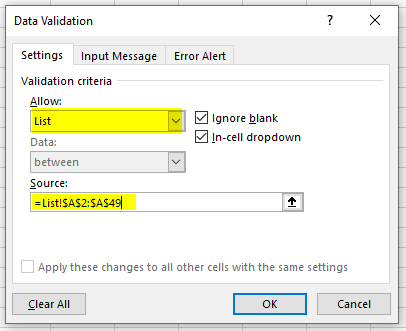 From the Allow drop-down, choose List. Click inside the Source box, then go back to the List tab on the spreadsheet and drag from the first car brand to the last, Range A2:A49, from Acura to Volvo. Do not include the “Car Brands” header. You are showing Excel the range to compare your data to. Only items in this list may be entered. The two checkboxes are checked by default: “Ignore blank” cells and create an “in-cell dropdown.” Click OK.