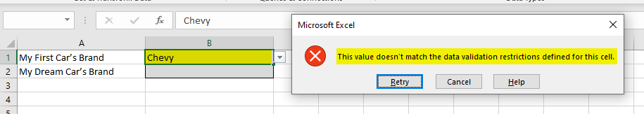 First let’s see if it validates our data with normal text entry. Type “Chevy” in Cell B1 and press Enter.An error message will appear because “Chevy” is not a “valid” entry when Excel compares it to our list. You can either “Retry” or “Cancel” and Excel will delete “Chevy” from Cell B1.