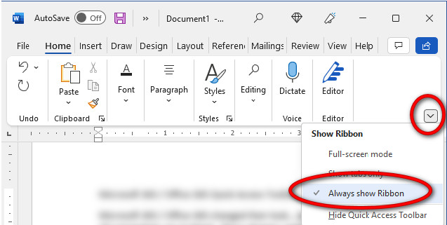 From the drop-down, you may click “Always Show Ribbon” and the menu tabs should stay visible until the next time they “hide.” I always tell my beginning Microsoft 365 / Office 365 student to keep it on this “Always Show Ribbon” setting. Seeing the commands on the ribbon seems to help them figure out what to do next.