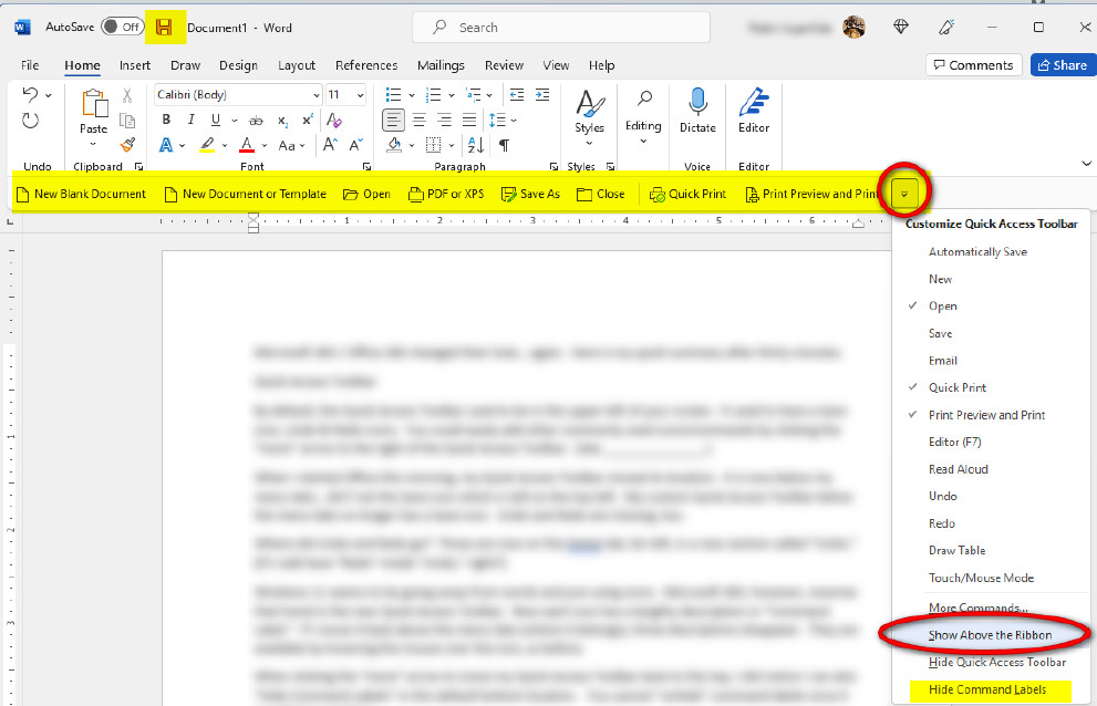 Windows 11 seems to be going away from words and just using icons. Microsoft 365, however, reverses that trend in the new Quick Access Toolbar. Now each icon has a lengthy description or “Command Label.” If I move it back above the menu tabs (where it belongs), those descriptions disappear. They are available by hovering the mouse over the icon, as before.