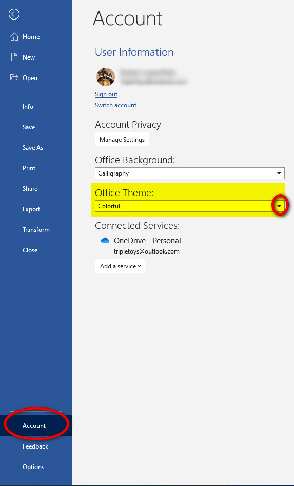 Click the File tab to enter the “backstage” screen. Select Account, the third option from the bottom.