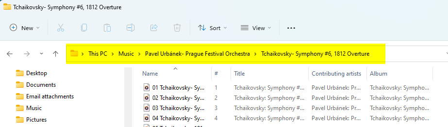 Almost every music player, such as Windows Media Player, rips the music in the same way and location. After your “rip” a CD, look inside your Music folder. There will be a folder for the artist. Double click to open that artist’s folder. There is a folder for that album. Double-click the album. There is file for each song. Click one song and your default music app will play that song. You can see the “path” through those folders in the screenshot below.