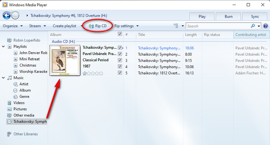 Windows Media Player may open up right to the CD by showing the album, or it may not. If you do not immediately see the album art, click on the album name in the Navigation Pane on the left. The album may start as “unknown album,” but as soon as your computer reaches out to the internet, it will know the name of the album, artist, each song, and hopefully find the album cover art.