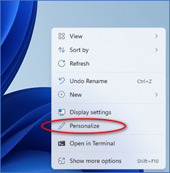 To browse through the built-in Microsoft Windows 11 themes, right-click anywhere on your Windows desktop. Do not right-click on an open window or the Toolbar. Choose “Personalize” on the pop-up menu.