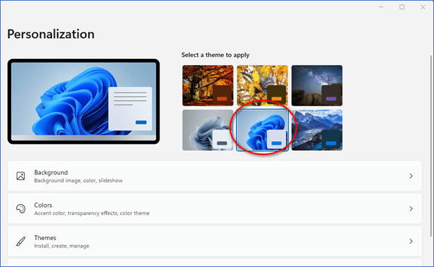 Click on the small thumbnail sample pictures at the top to “Select a theme to apply.” Dark themes will keep the Taskbar dark, but the open windows will have a dark theme. The blue “flower” theme will turn the Taskbar light, but the open windows will stick with a light theme.