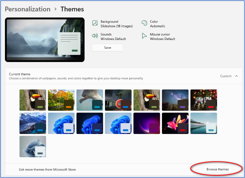To select more Themes from the Microsoft Store, click on the Themes option below the images. You can “Get more themes from Microsoft Store” by selecting “Browse Themes.