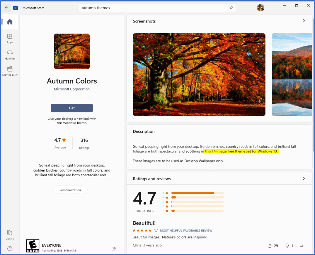 In the Microsoft Store window, type “Themes” in the Search bar. You can also add words such as “autumn” to your search, for example, type “autumn themes” and press Enter.